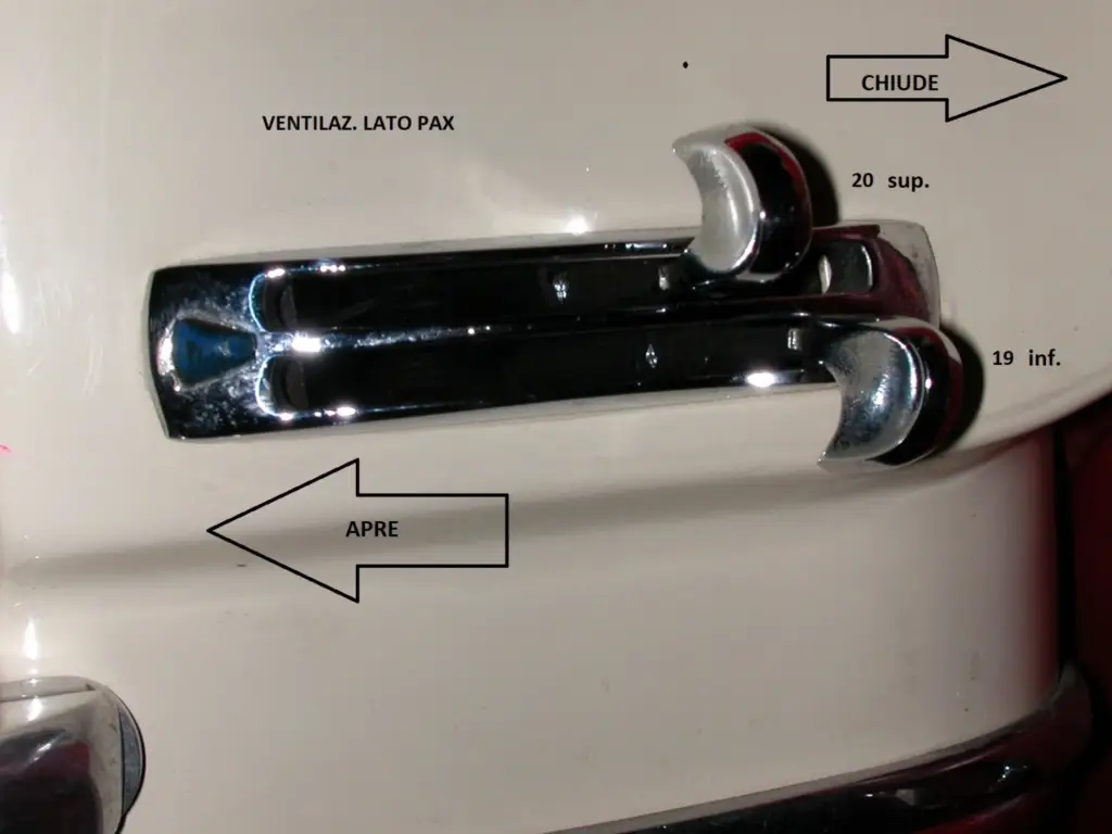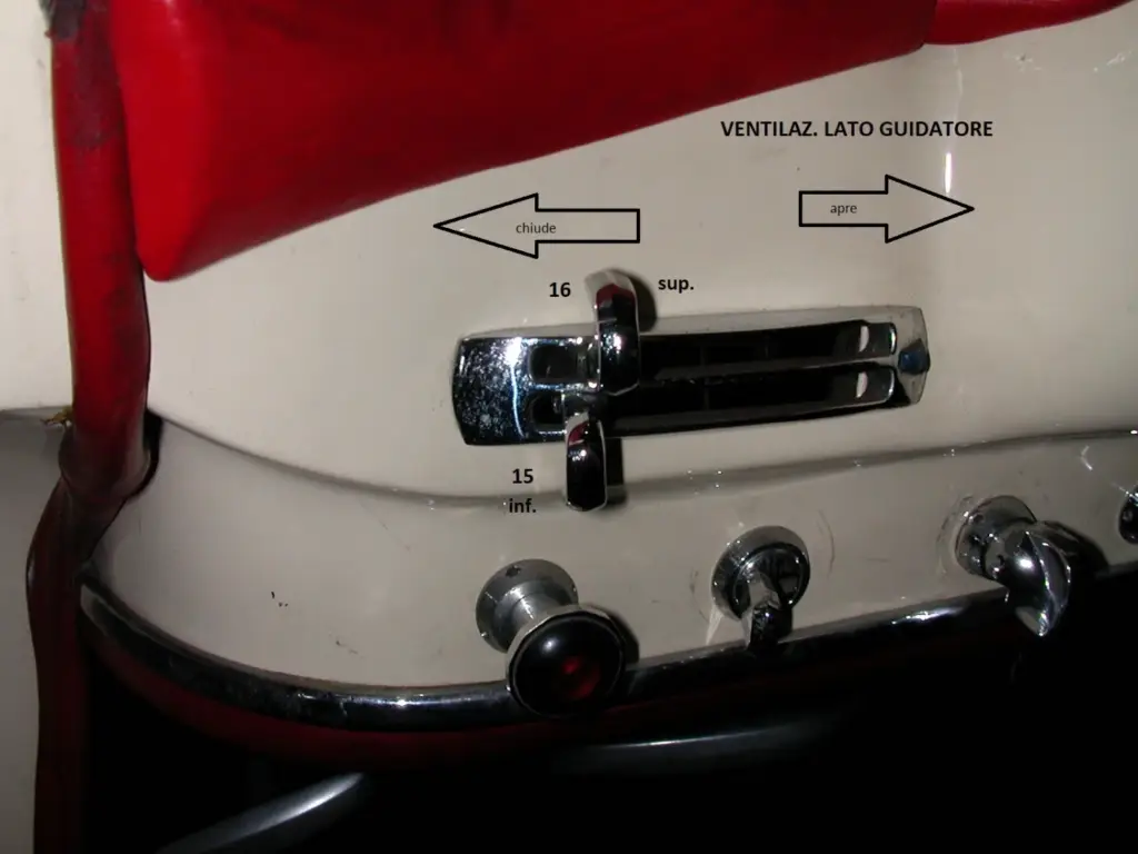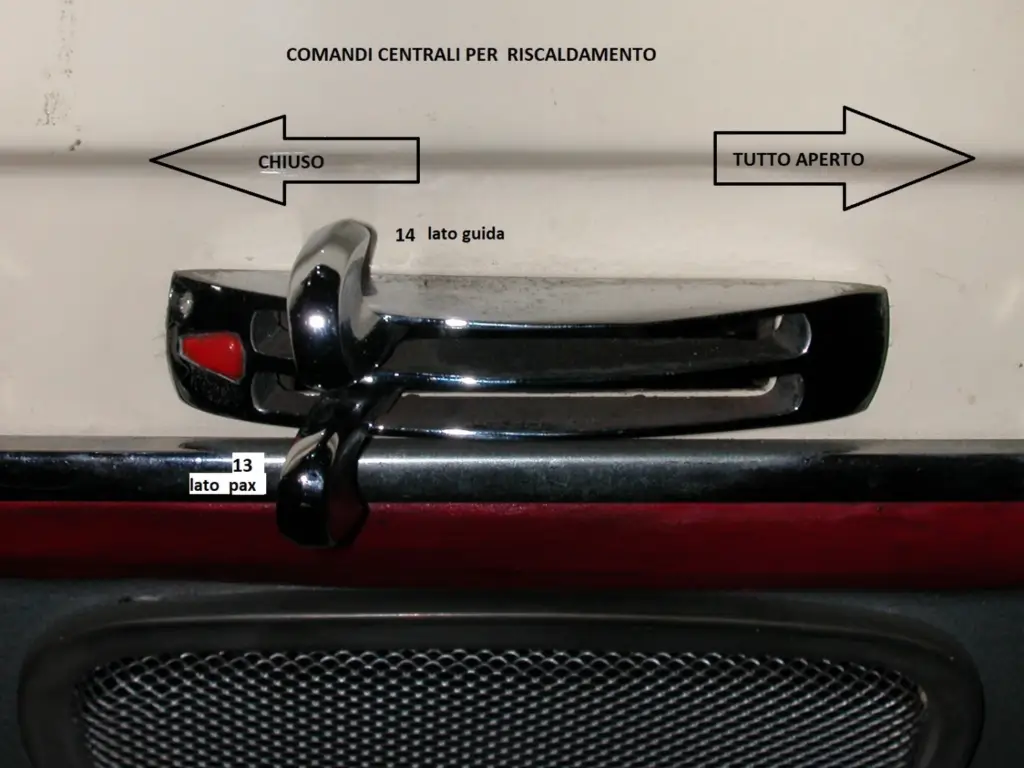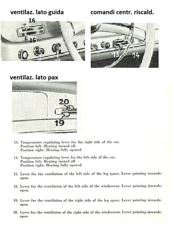 Ciascun gruppo di controllo dei flussi d’aria è composto da due leve, una superiore ed una inferiore: la leva superiore comanda l’afflusso alle bocchette verso il parabrezza, mentre quella inferiore alla zona delle gambe degli occupanti. Per il lato guidatore è inoltre disponibile la ventilazione forzata (in verità piuttosto debole), comandata dal pomello-tiretto (con spia luminosa) posto all’estrema sx della parte inferiore del cruscotto . Seguendo questa logica, è quindi abbastanza facile orientarsi. Finora abbiamo parlato di afflusso d’aria: a determinare se questa sia semplicemente l’aria fresca esterna, oppure riscaldata tramite i due scambiatori di calore tra l’acqua di raffreddamento motore e l’aria, posti lungo i condotti d’ingresso aria esterna nel vano motore, provvedono i comandi posti al centro del cruscotto, in basso. In questi, la mostrina reca sulla sx un triangolo rosso, che quindi risulta col vertice rivolto a sx e la base verso il centro. In questo caso la forma del triangolo simboleggia la temperatura che si vuole per l’aria in ingresso: leve spostate verso il vertice = riscaldamento chiuso e quindi aria entrante a temperatura esterna; leve spostate verso la base = temperatura aria massima. La leva superiore regola la temperatura del lato passeggero, quella inferiore del lato guidatore: praticamente una antesignana della moderna regolazione bi-zona…. Perché tutto funzioni come sopra, occorre fare attenzione che i cilindretti interni dei rubinetti di comando dell’ acqua calda negli scambiatori di calore sopracitati siano montati correttamente, cioè col foro di passaggio acqua posto secondo il flusso quando le levette centrali sono spostate a dx, e trasversalmente(cioè in chiusura) con le levette spostate a sx ; le due posizioni sono separate da ¼ di giro. Infine è necessario un buon ingrassaggio dei fili d’acciaio interni ai cavi bowden di tutti i comandi per l’adeguata scorrevolezza.