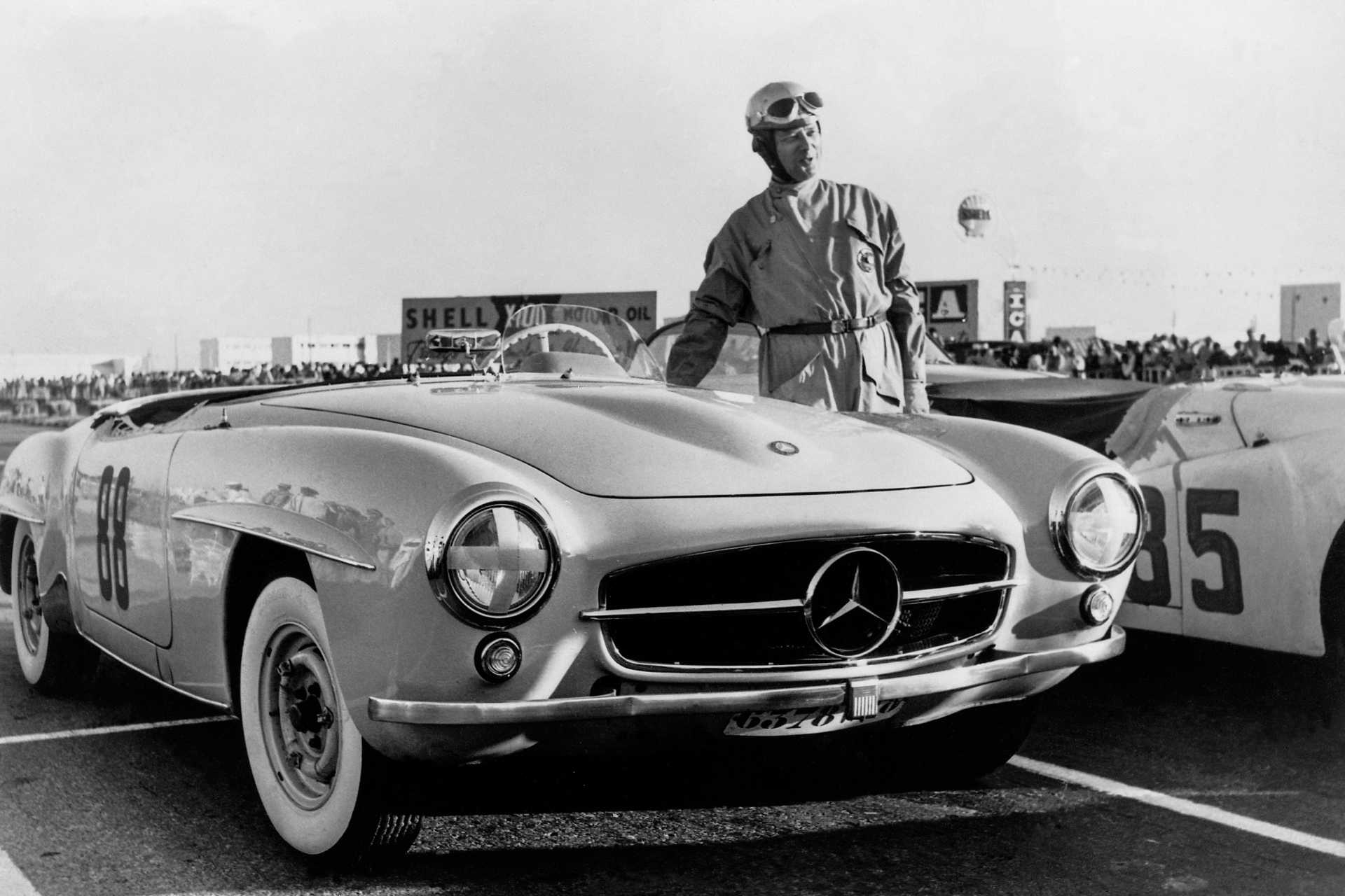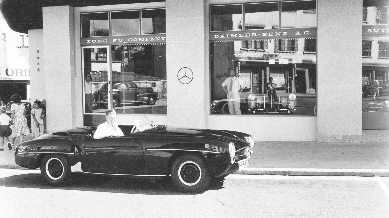 Come sappiamo, nei programmi della Casa di Stoccarda, vi era l’alternativa di acquistare la 190SL per utilizzarla in gare sportive. La macchina si presentava con un parabrezza tipo “barchetta”, niente paraurti, niente coppe ruote ed un motore non dissimile dal modello stradale ma sicuramente elaborato. Dei diciassette modelli “Rennsport” allestiti, fu proprio l’importatore Zung Fu di Hong Kong a richiederne uno e a portarlo in gara nel Gran Prix di Macao. La macchina era di colore scuro. Purtroppo tutti i modelli destinati alle competizioni furono poi ritirati e riconvertiti da Stoccarda. La Federazione Sportiva aveva però deciso di omologare la 190SL non nella categoria turismo, come richiesto da Stoccarda, bensì nella categoria Sport sotto 2.000cc. Una categoria agguerrita dove molti piloti privati guidavano vetture molto più performanti e leggere come le Maserati. Sarebbe stato possibile per Mercedes-Benz partire con questo svantaggio? Da qui il ritiro dai campi di gara. I 17 modelli gara furono quindi smontati ed il progetto fu accantonato. Il modello argento nella foto a colori è una replica fedele del Classic Center di Stoccarda. Tuttavia la si può tranquillamente annoverare come un falso certificato dalla Casa Madre. Un bel ricordo.